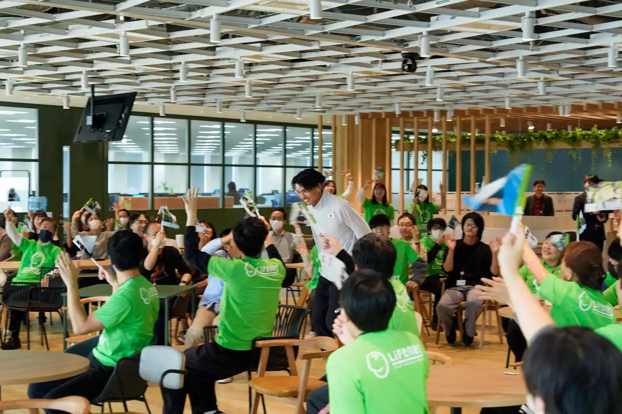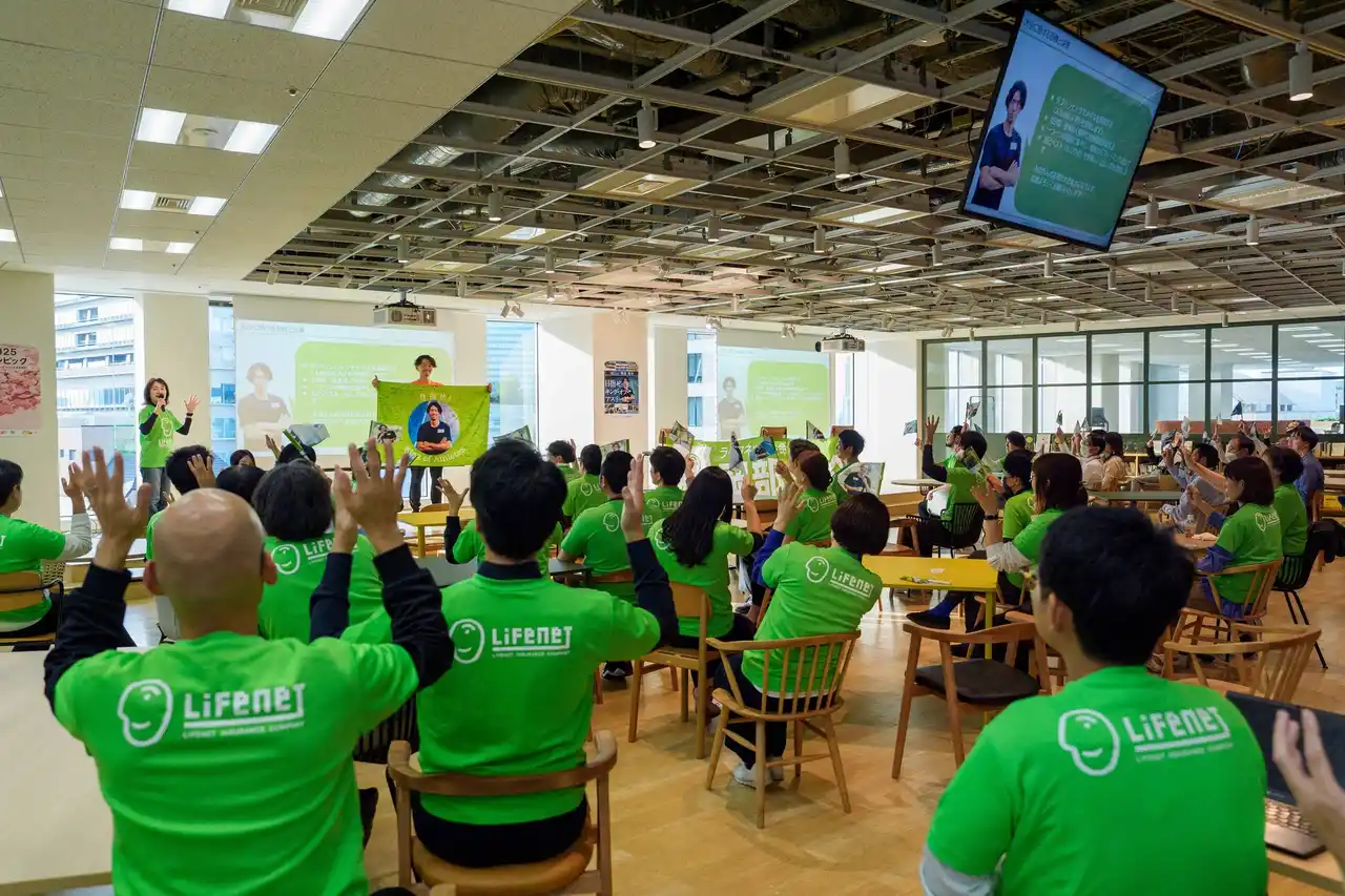ライフネット生命本社で行った壮行会では、晴れて2025年のデフリンピック日本代表に選ばれ、十種競技では初めての出場となる岡部を、思い思いに旗を振り、手話で拍手を送る社員たちが笑顔で迎えました。 |