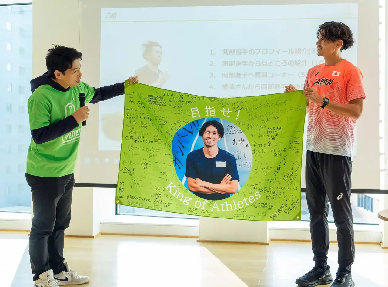 代表取締役社長の横澤は、「35歳から十種競技に挑戦し、世界の舞台に立つまで、岡部さんの努力や成長の過程をずっと見てきました。それが、我々の日頃の仕事への姿勢やモチベーションに大きな影響を与えていると思います。デフリンピック当日は、十種競技の最後の種目である1500mが終わった後、ぜひスタンドを見上げてみてください。岡部さんが笑顔でいられるように、ライフネット生命一同全力で応援します」と激励し、「目指せ!King of Athletes」と書かれた社員からのメッセージが詰まった応援旗を贈呈しました。 |