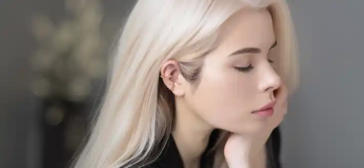 ダイヤモンドとマルチカラーのイヤーカフリングを重ね付けしたモデルの着用シーン |