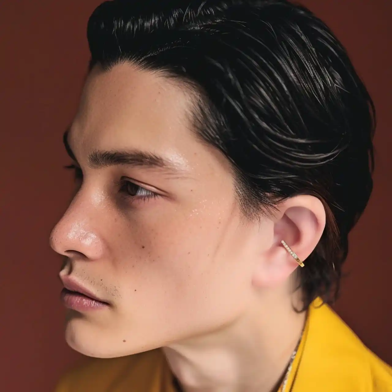 男性モデルがダイヤモンドのイヤーカフリングを着用したシーン |