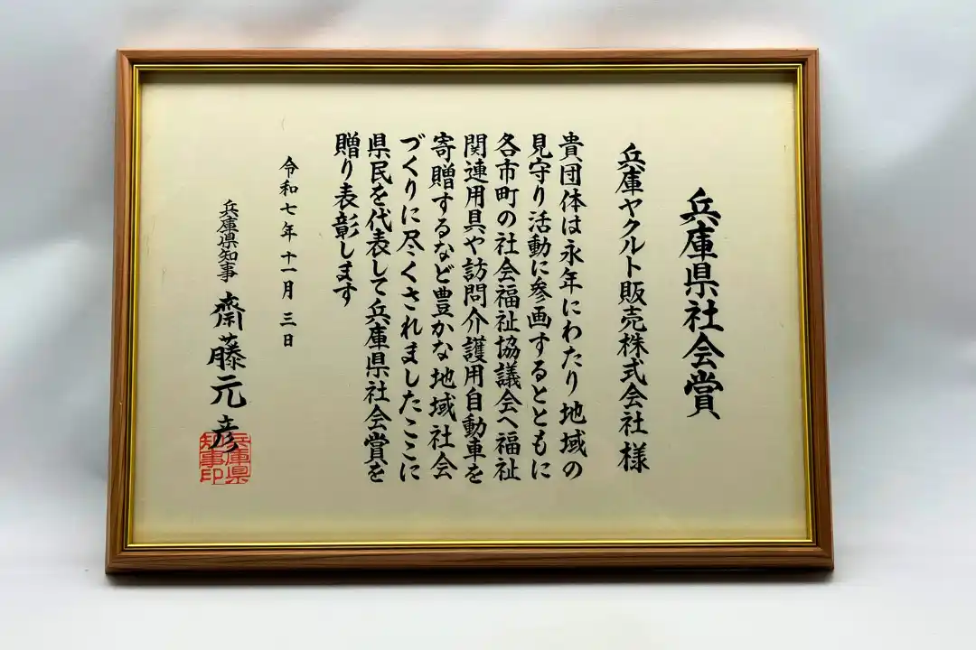 兵庫ヤクルト販売株式会社(以下、兵庫ヤクルト)は、この度兵庫県より「令和7年度 兵庫県社会賞」を受賞いたしました。本賞は、社会奉仕活動や文化活動などを通じて、明るく豊かな地域社会または職域づくりに貢献した個人や団体を表彰するものです。当社が長年にわたり実施してきた「福祉ヤクルト」における福祉関連用具や訪問介護用自動車の寄贈が、県内の社会福祉のさらなる発展に継続的に貢献していると高くご評価いただき、受賞の運びとなりました。 |