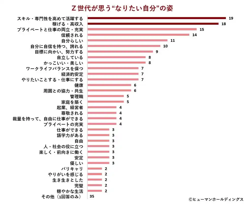 このことから、“なりたい自分”の姿には、仕事での成長や経済的安定、生活の充実をバランスよく実現したいという意識が強いと考えられます。 |
