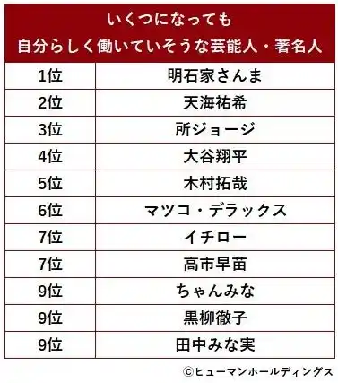 回答理由を見ると、明石家さんまさんは「いつも元気で楽しそう」「自分の好きなことを追求している」「自由でキャラがブレない」など、楽しみながら働いている様子が評価されています。天海祐希さんは「強く、自信にあふれ、信念を持っている」ことが理由として多く挙がり、プロフェッショナルな姿勢が支持されました。所ジョージは「好きなことを仕事にしつつ人生を楽しんでいる」「自由で無理をしていなさそう」といった回答が多く見られました。 |