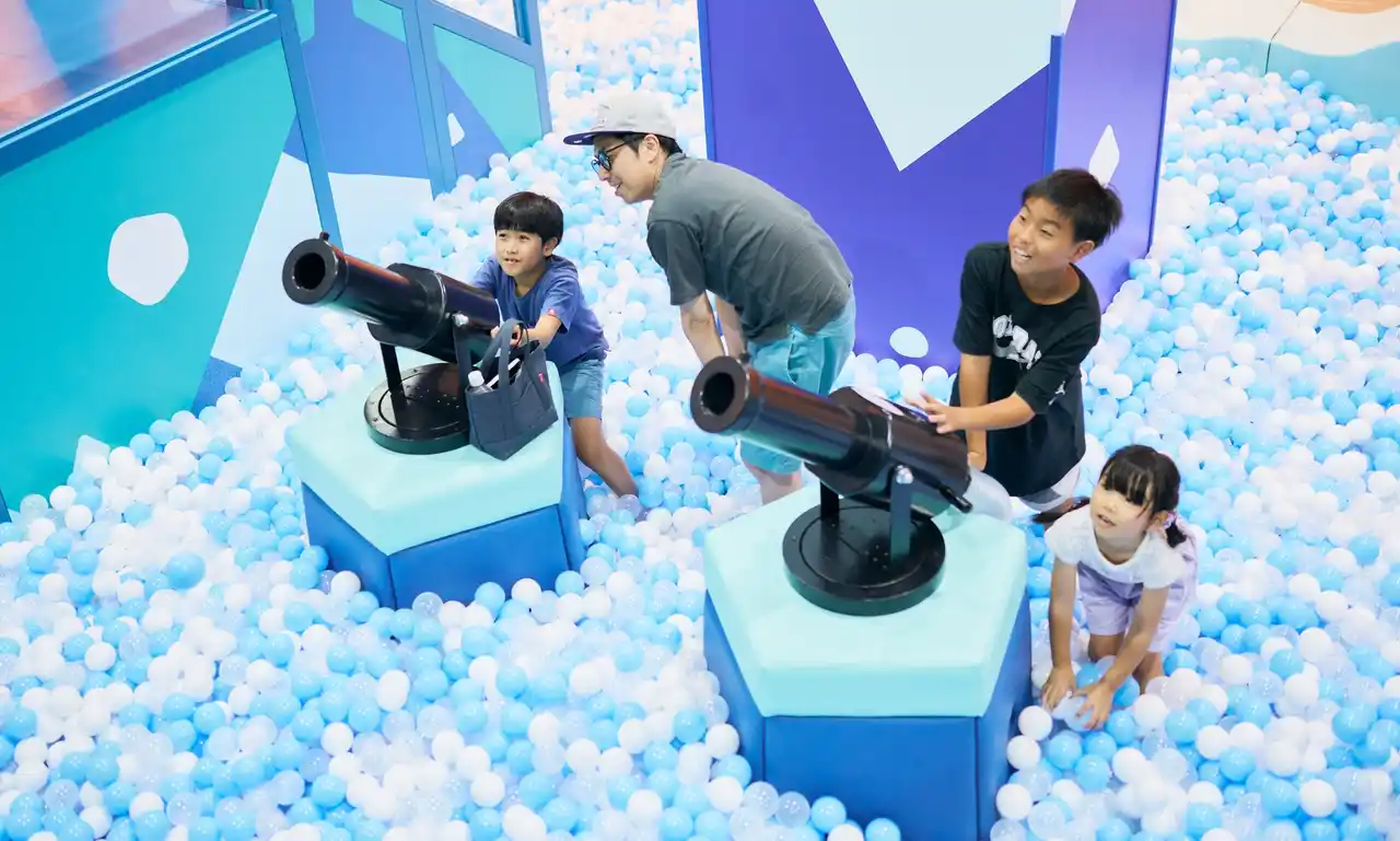 氷山をイメージした氷山スライダーを滑ったらそのまま広いボールプールの海にダイブ! ボールをバズーカで噴射する的当てゲームも大人気。 |