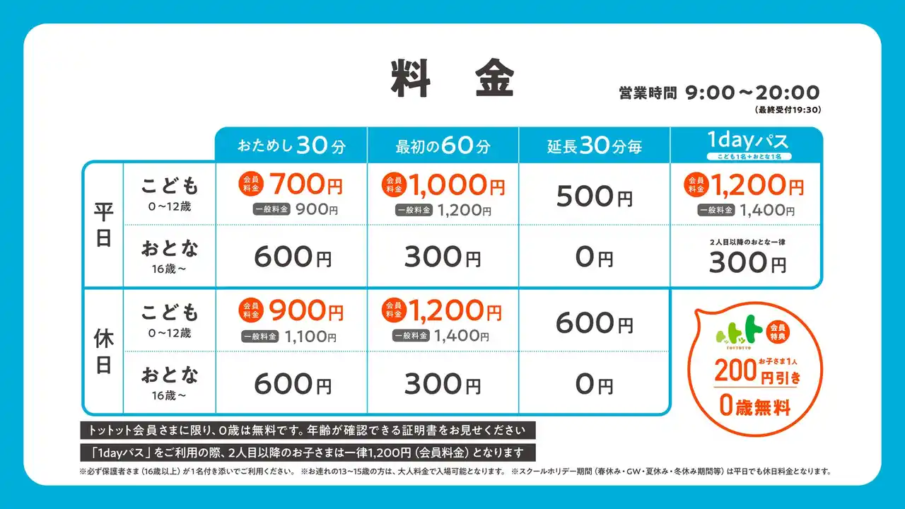 ・上記料金は子育て応援アプリ「トットット」に会員登録された方の会員価格です。入場当日にご登録いただいた場合も、当日から会員料金が適応されます。 |