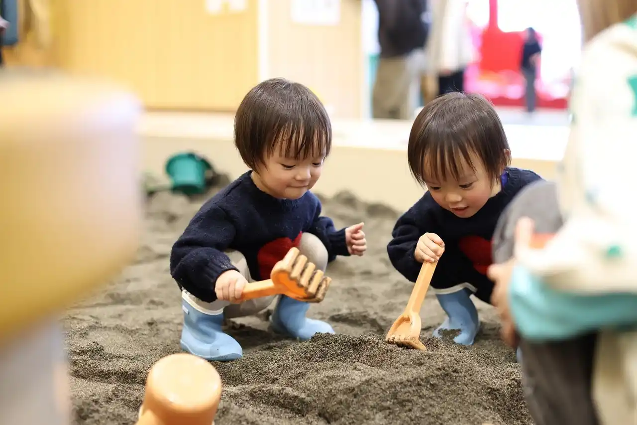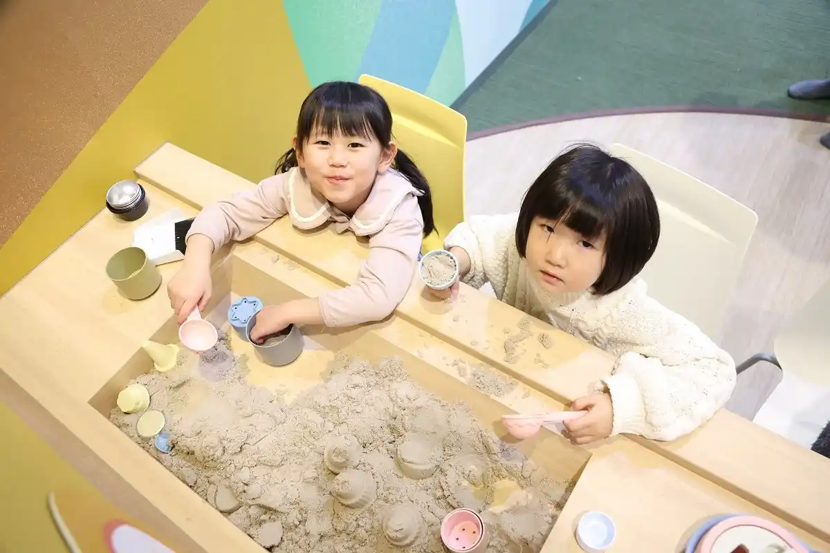想像力と創造力が培われる砂遊びができる砂場コーナー。砂は安心の抗菌砂です。椅子に座って遊べる砂遊びコーナーは車いすでもご利用可能です。 |