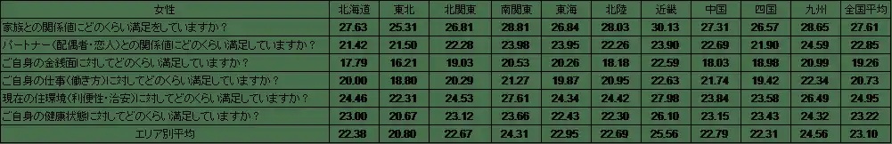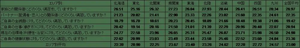 1位の近畿エリア(24.62点)は、前述のとおり、女性の幸福度が25.56点で全10エリアの中でトップに。項目別に見ても「家族との関係値」「金銭面」「仕事(働き方)」「住環境」「健康状態」の5項目でトップとなりました。 |
