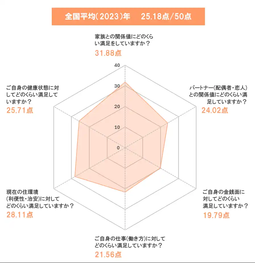 当社の幸福度調査では、「家族との関係値」「パートナー(配偶者・恋人)との関係値」「金銭面」「仕事(働き方)」「住環境」「健康状態」の6項目について、どのくらい幸福感を感じているかを調査しています。 |
