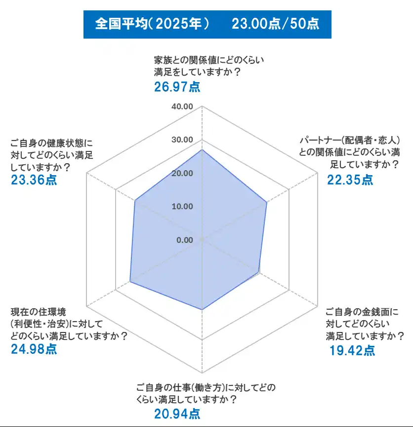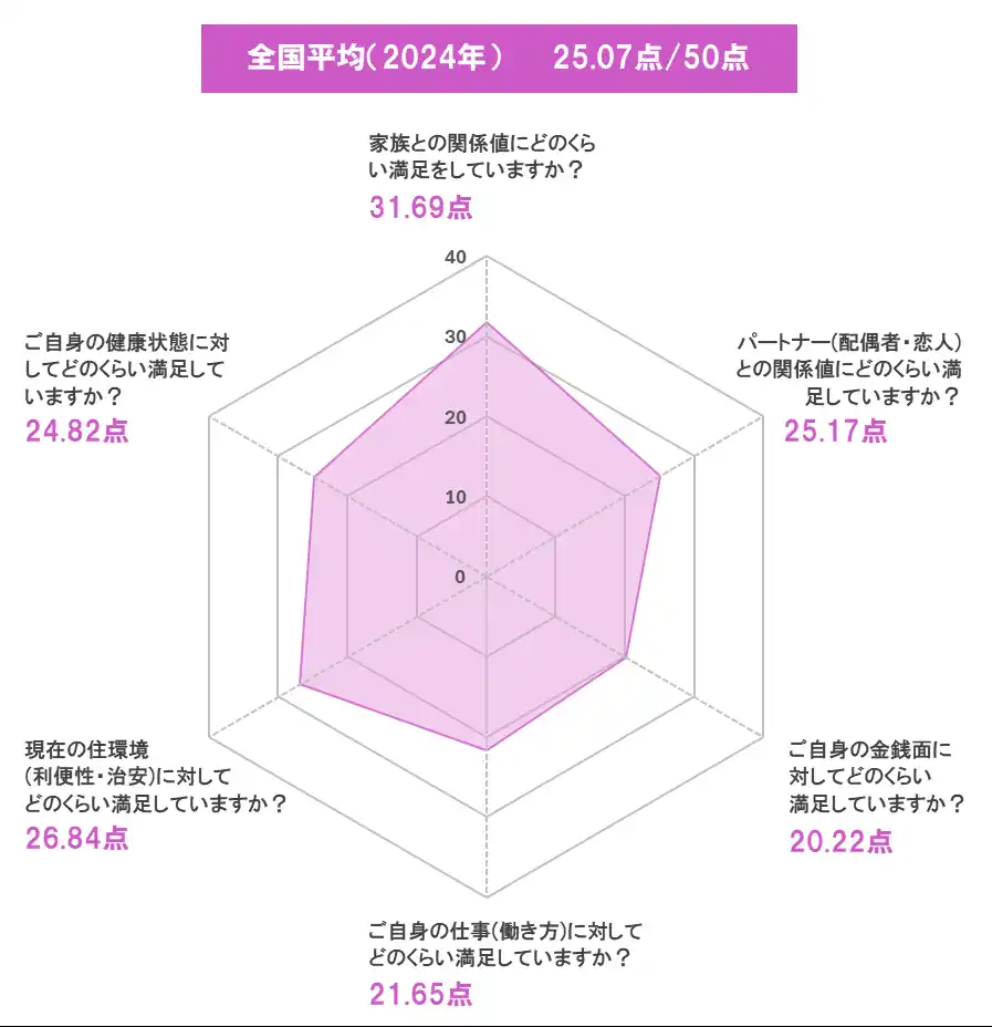 幸福度が最も高かったのは、3年連続で「家族との関係値」(26.97点)でした。最も低かったのは「金銭面」(19.42点)の満足度で、2024年調査(20.22点)、2023年調査(19.79点)よりもさらに低く、過去最低となりました。 |