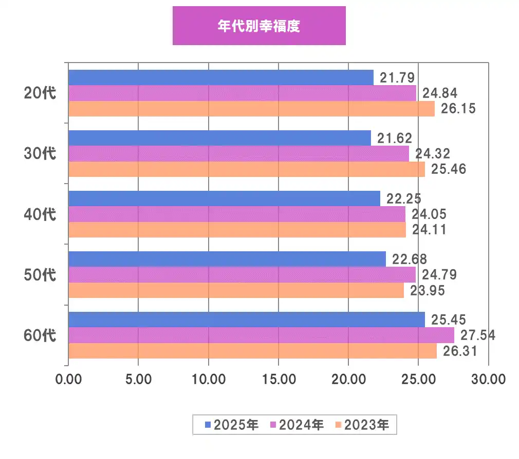 2025年度調査の幸福度を年代別に集計してみたところ、60代(25.45点)、50代(22.68点)、40代(22.25点)、20代(21.79点)、30代(21.62点)という順で幸福度が高くなりました。おおむね年代が上がるにつれて幸福度が高くなる傾向があるようです。 |