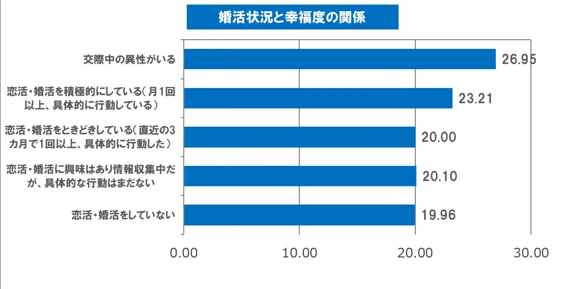「総合的な満足度」と掛け合わせて幸福度を算出したところ、「交際中の異性がいる」人の幸福度の平均が26.95点、「恋活・婚活を積極的にしている」人が23.21点、「恋活・婚活をときどきしている」人が20.00点、「恋活・婚活に興味はあり情報収集中だが、具体的な行動はまだない」人が20.10点、「恋活・婚活をしていない」人が19.96点という結果になりました。 |