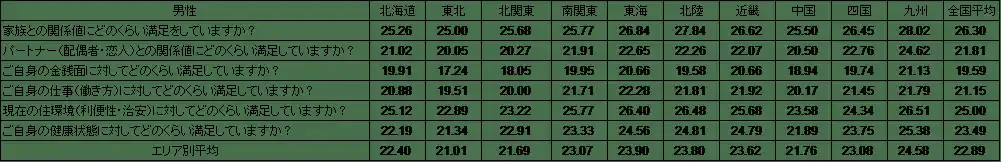 エリア別で幸福度の男女差が大きかったのは近畿でした。男性23.62点、女性25.56点と1.94ポイントの差があり、女性が最も高いエリアも近畿でした。なお、男性が女性よりも幸福な地域のうち最も差が大きかったのは北陸で、男性23.80点、女性22.69点と1.11ポイントの差となりました。 |