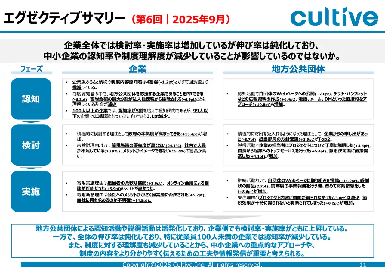 ・調査目的: 企業版ふるさと納税に関する実態調査を企業、自治体双方に行うことにより、企業版ふるさと納税をより一層普及させる。また、定点調査により検討度合いの変化などを明らかにする。 |