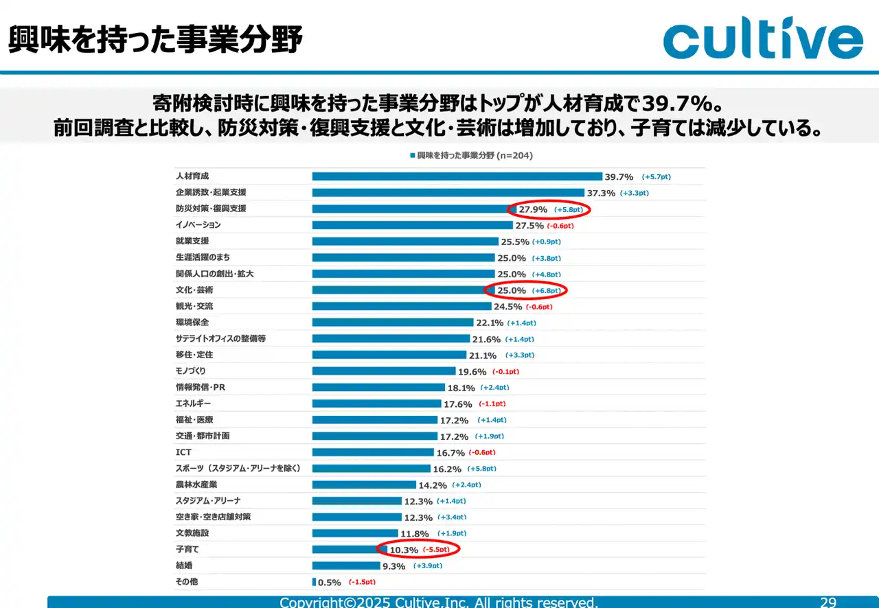 また、企業が興味をもつ企業版ふるさと納税の寄附募集事業分野の傾向変化にも焦点を当てております。 |