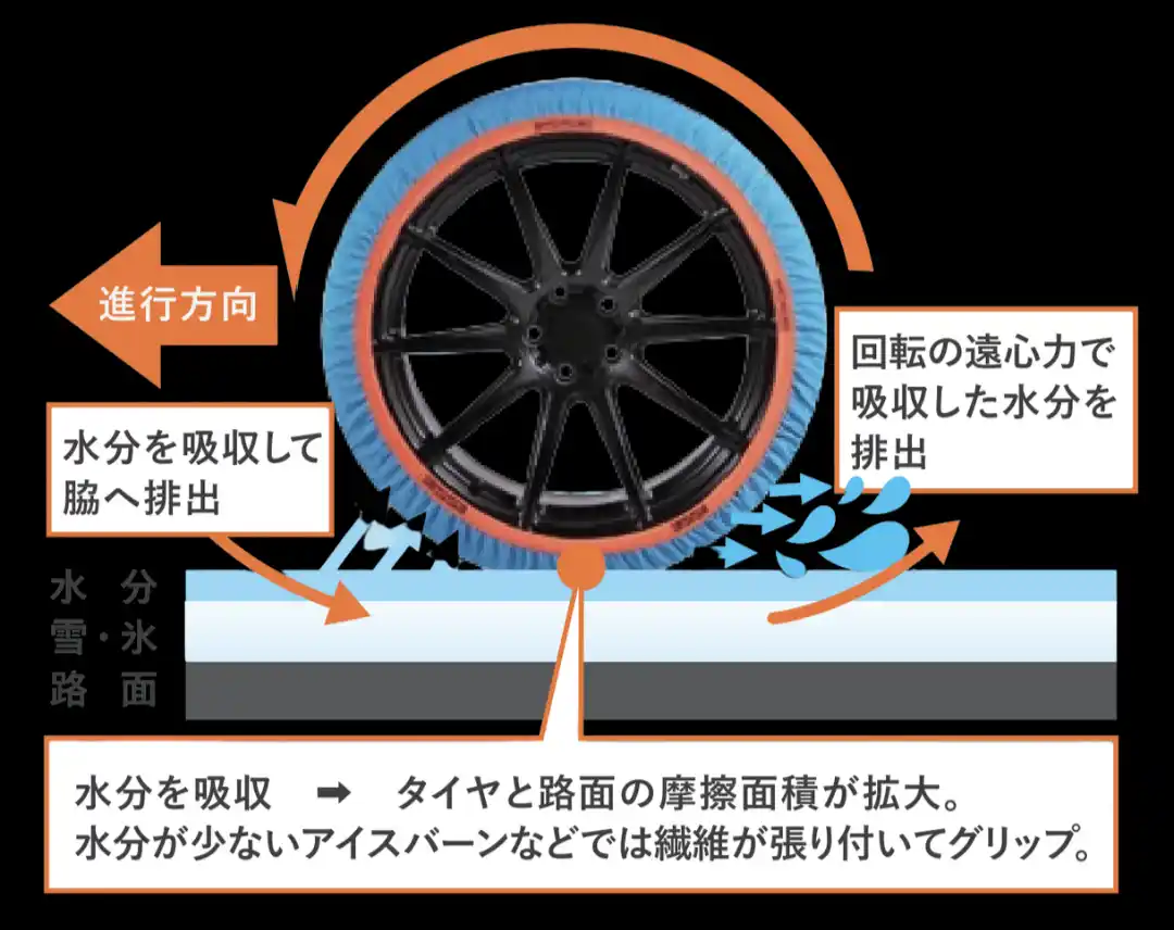 タイヤが雪に接触すると雪が瞬時に溶け、水膜が発生します。この水膜がスリップの主な原因となります。イッセ・スノーソックス リサイクルは、強い繊維を束ねた「より糸」を立体的に編み込み、しっかりとした厚みをもたせています。この構造が路面の水分を素早くキャッチし、外側へと排出することでグリップ力を回復させます。 |