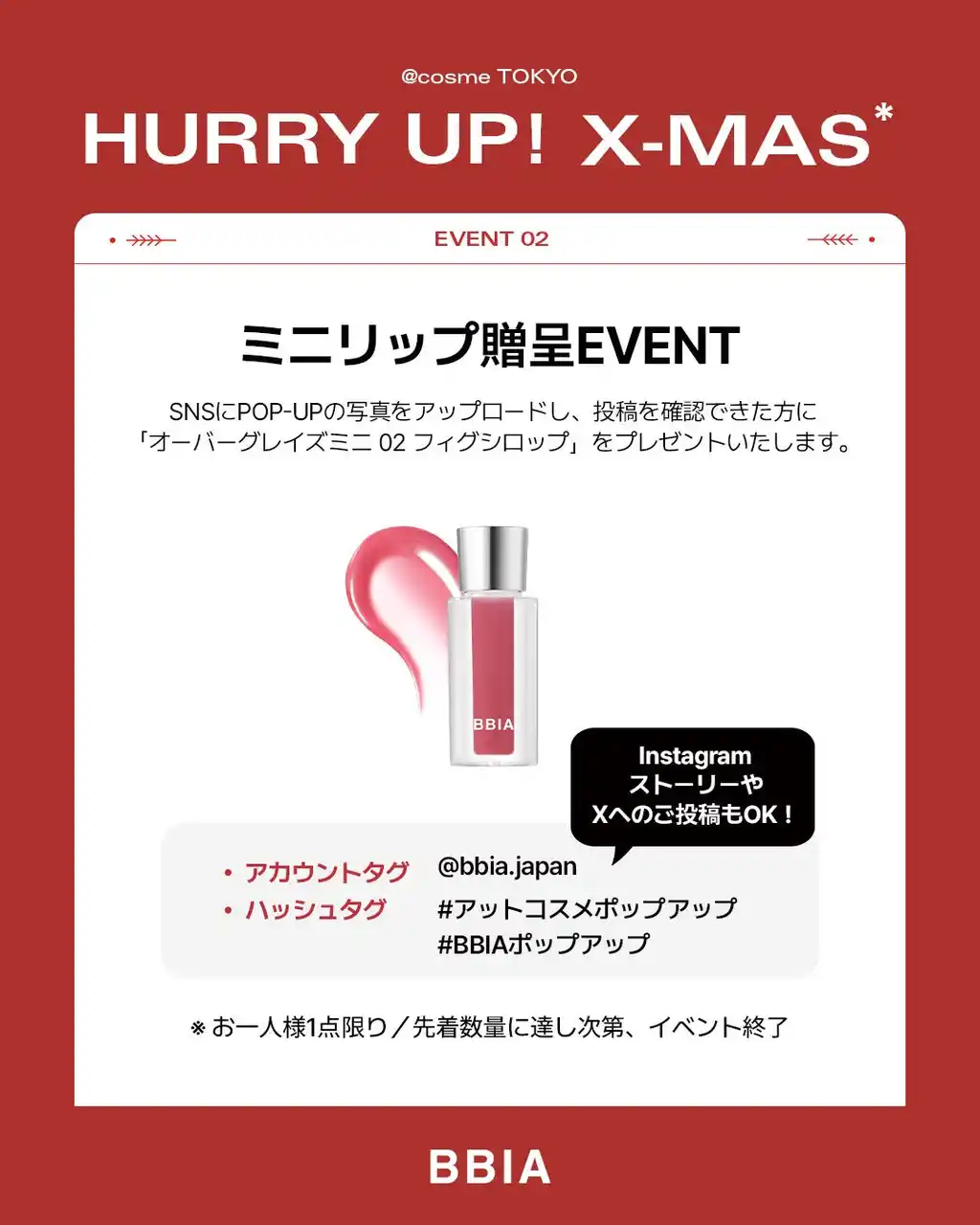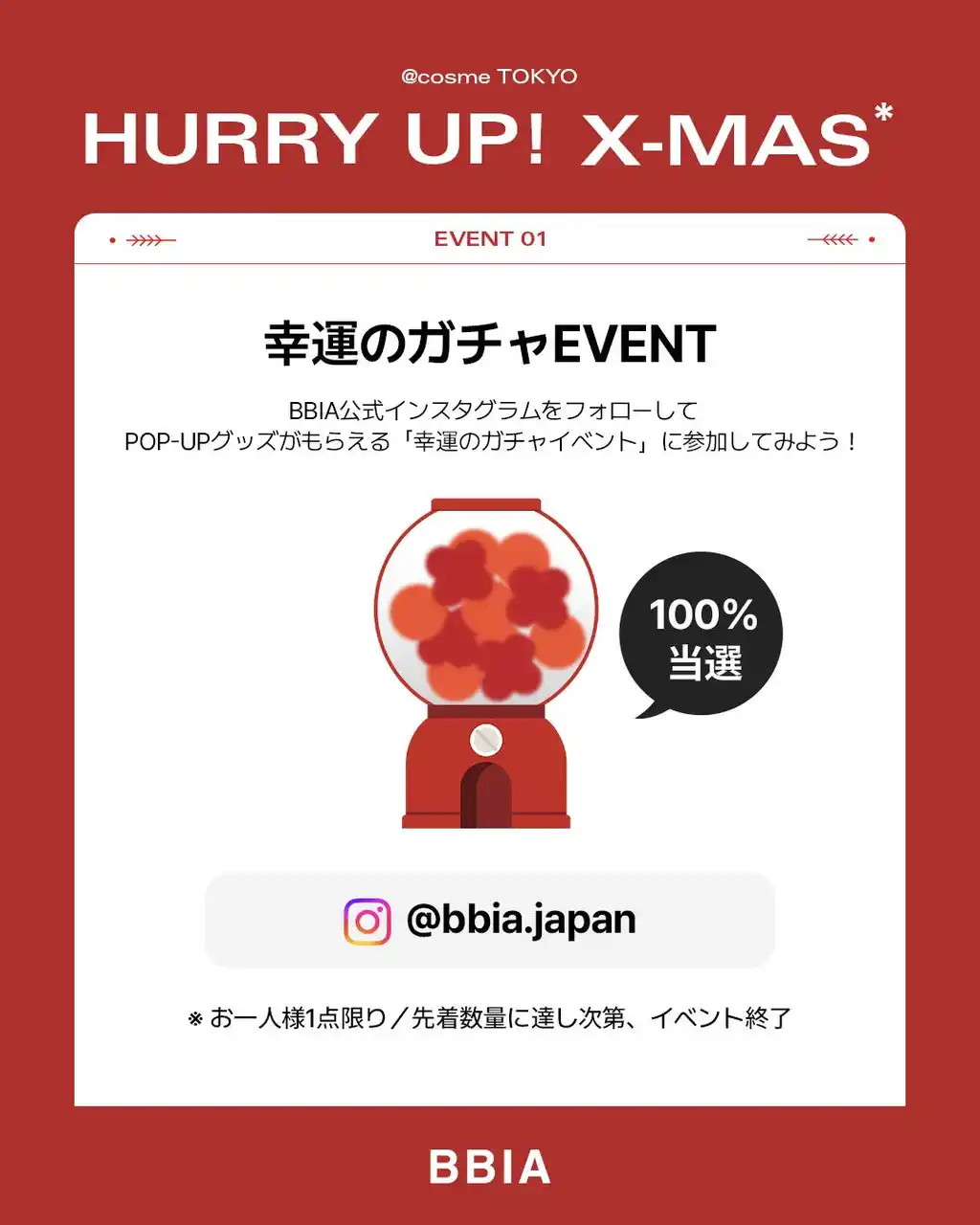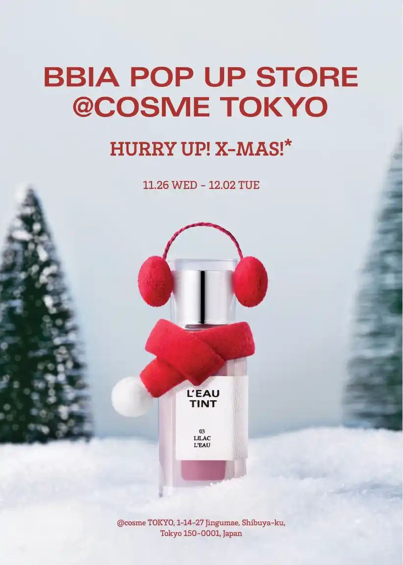 韓国コスメブランド「BBIA(ピアー)」は、2025年11月26日(水)~12月2日(火)の期間、@cosme TOKYO2階にてクリスマスをテーマにしたPOPUPイベントを開催いたします。 |