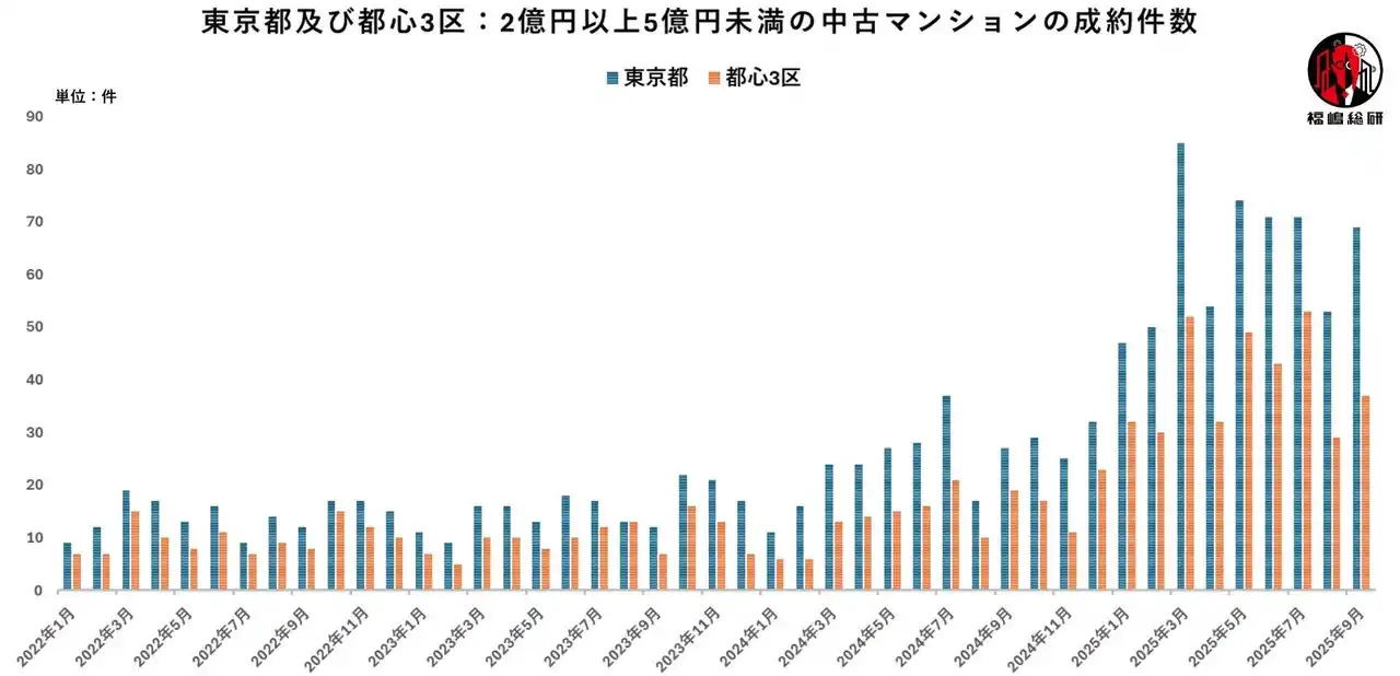 | 次に、2億~5億円の価格帯です。ここは2023年頃までは都心部の中核的な取引ゾーンであり、富裕層・企業経営者層・外資系エグゼクティブ層などによって支えられていました。 | ||||||||||||||