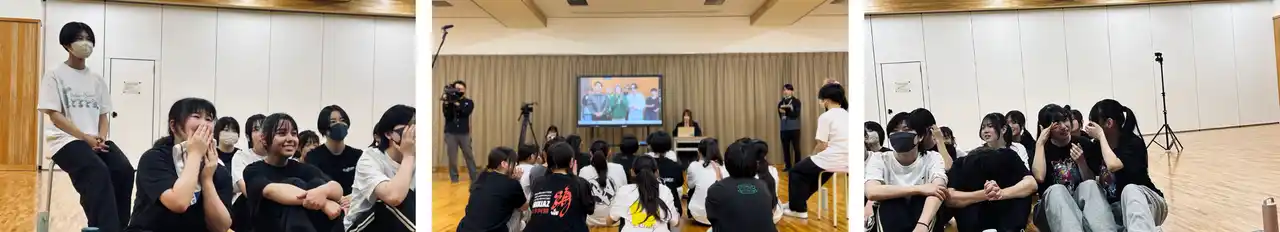 まるでダンス部生徒たちへサプライズのお知らせを届けにきたかような澄んだ風が優しく吹く放課後、急遽いつもの練習場所とは違う多目的ホールに集められたダンス部生徒たち。いつもとは違う緊張感に包まれる中、ダンス部顧問の安倍先生より「本日はある重大な発表があり皆さんに集まっていただきました。なんと来年2026年1月に静岡県で開催される東京ガールズコレクションに皆さんに出演していただくことが決定ました!」と告げられ、涙する生徒の姿が。想像以上のリアクションに、「ちょっと、泣いちゃった…!」と安倍先生も驚きを隠せない様子の中、続けてKID PHENOMENONからのサプライズビデオメッセージが披露されると、「ちょっと待って!推しです!」と歓喜の声が上がりました。 |