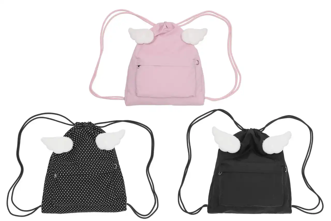 「珍しいドット柄ナップサックに、『空を飛ぶ気分』を演出する羽のアクセントを加えた遊び心あふれるデザインがこだわりポイントです。」 |