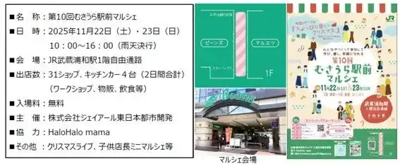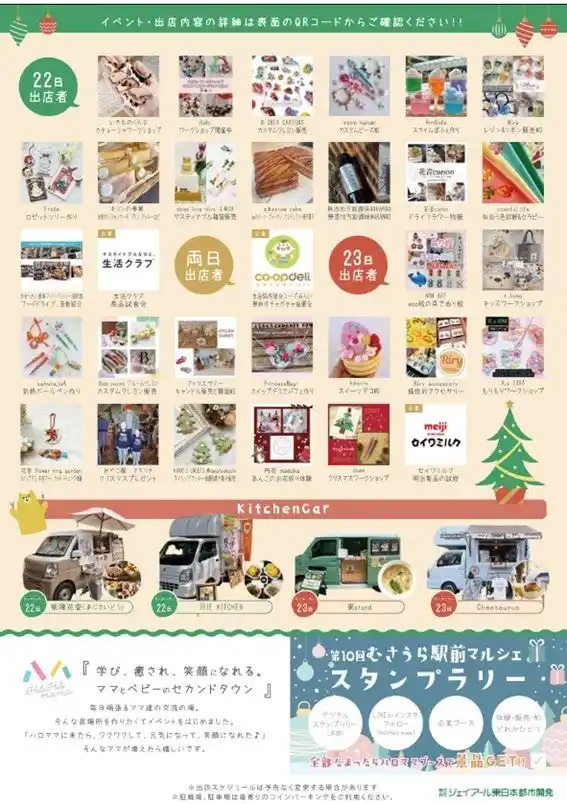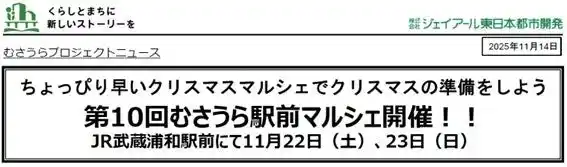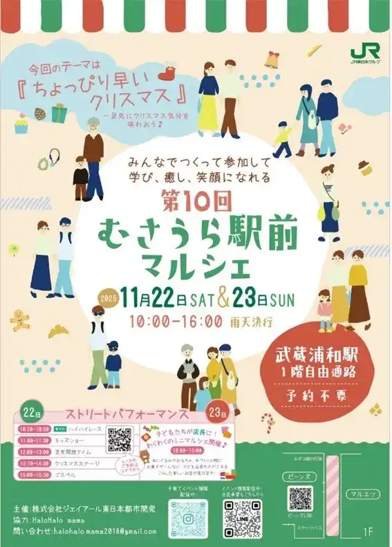 | 2025年11月22日(土)・23日(日)の2日間、JR武蔵浦和駅前にて地域で活動するHaloHalo mamaと連携し「第10回むさうら駅前マルシェ」を開催いたします。今回のテーマは「ちょっぴり早いクリスマス!」。クリスマスにちなんだワークショップや商品が盛りだくさん。みんなでワクワク楽しい冬の支度をしよう。 | |||