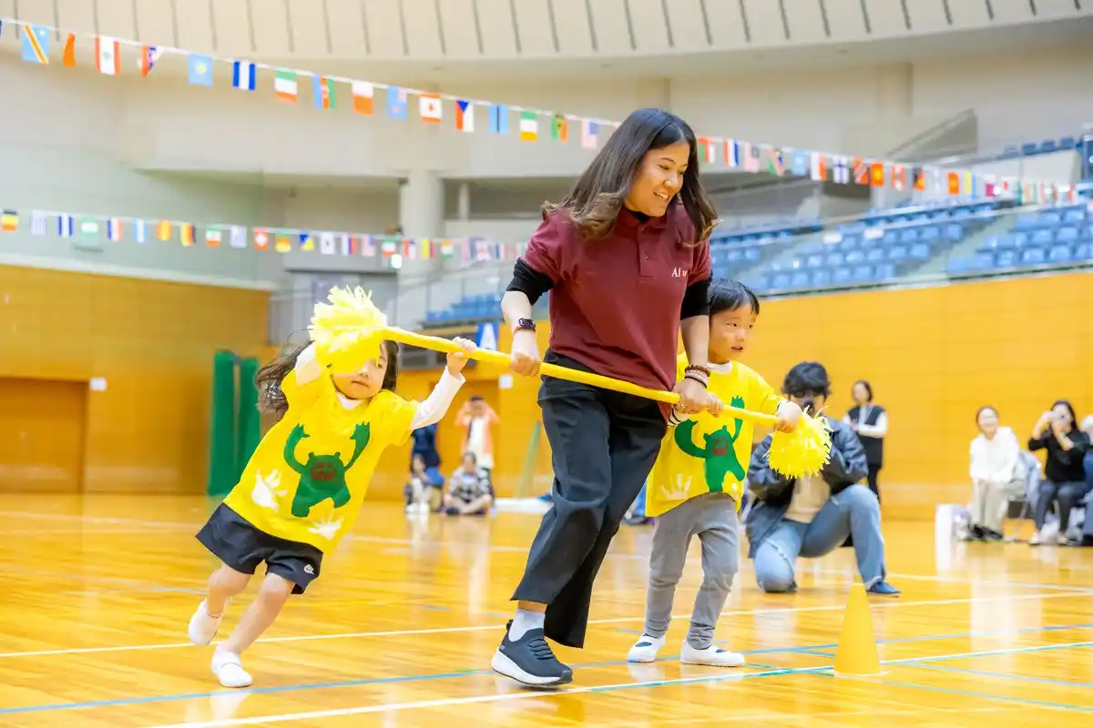 | 海外の学校や園では、運動会がショーのように構成されることも多く、アライブインターナショナルスクールのスポーツデイでもそうした国際色豊かな演出が特色です。当日は外国人講師が英語でDJを務め、音楽や掛け声でイベントを盛り上げます。 | ||||||||||||||