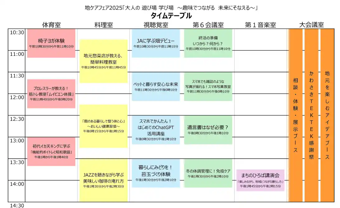 川崎市は、令和7年11月24日(月・振休)に、人生100年時代に備える地ケアフェア2025を開催いたします。3回目となる今年度は、「大人の 遊び場 学び場」と題し、新しい趣味への挑戦で新たな出会いやつながりのきっかけの一歩を踏み出せるよう、バラエティに富んだ講座・イベントを開催します。同時に、介護・認知症・終活情報を学ぶことのできる講座・展示等も開催します。 |