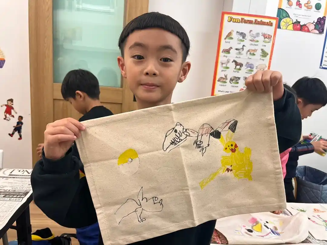 アイロンを使ってどのようにランチョンマットに絵をうつすのか、興味深々で見学していた子どもたち。自分の好みの絵を描き、個性豊かな作品を完成することができました。他の子の作品を見たり、誇らしげに自分の作品を見せてくれる姿が印象的でした。英語を学ぶだけでなく、アートを通じて創造力と自己表現力を高められた時間となりました。 |