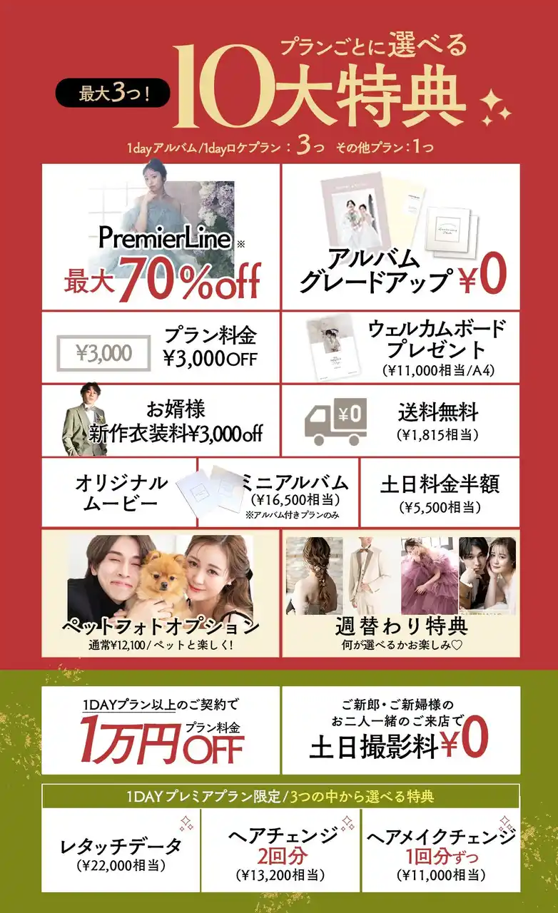 「予算も気になるけれど、とことんこだわりたい」という方へ朗報です。このフェアでは、最大90,000円相当の豪華特典をご用意。特に「1dayアルバムプラン以上」の即日ご契約で、プラン料金から10,000円OFFとなる特典や、お二人揃ってのご来店で土日祝日撮影料金(11,000円相当)が無料になる特典など、大変お得な内容です。この機会に、理想のウェディングフォトを賢くお得に叶えましょう。 |