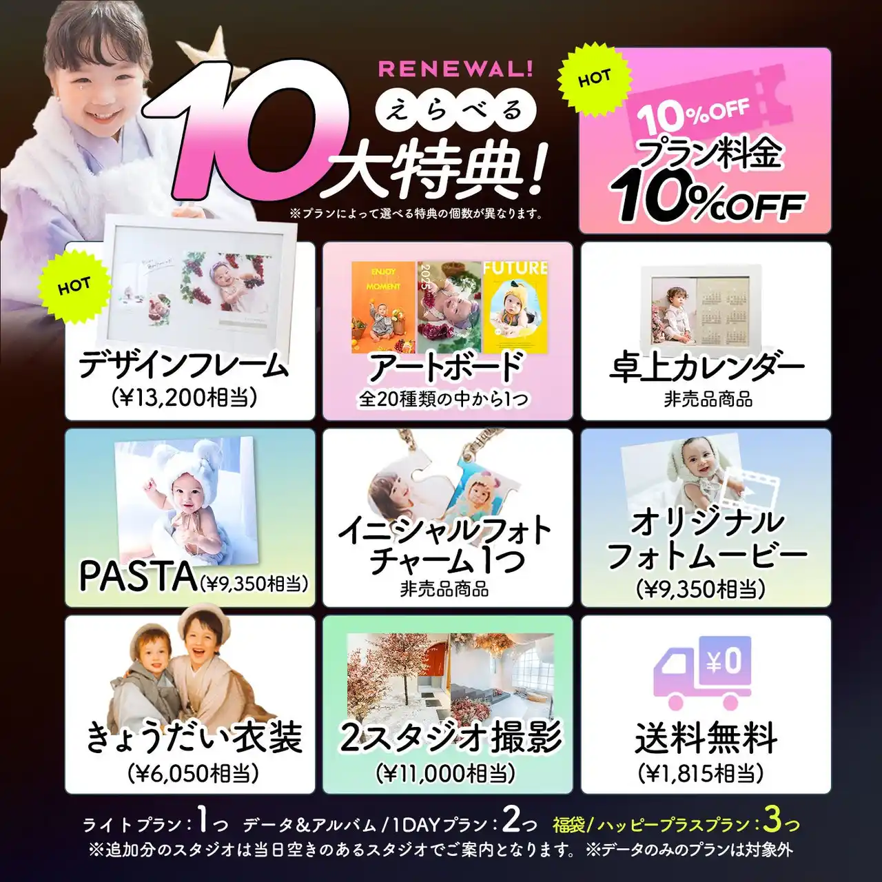 ライトプラン、データ&アルバムプラン、ハッピープラスプランなど(データのみプランは対象外)。 |