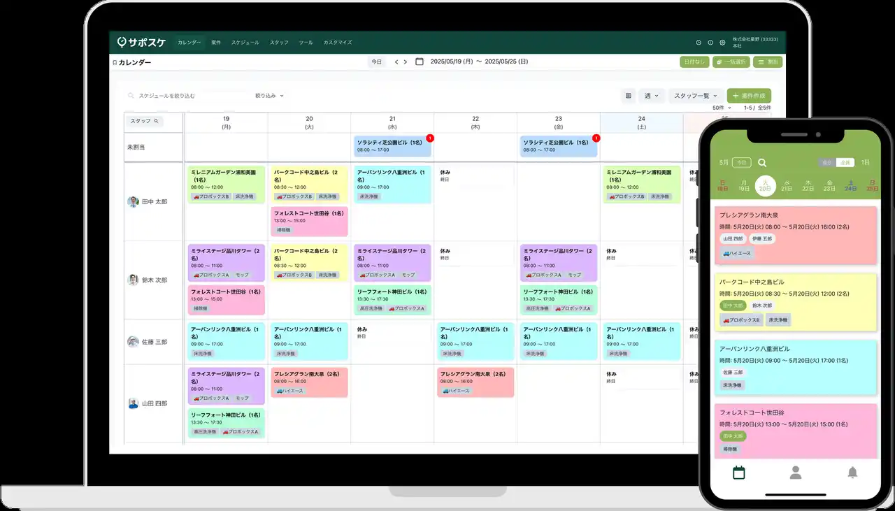 サポスケは管理者がスタッフの予定を決めている企業を中心に、専門工事・ビルメンテナンス・訪問看護/介護・イベント運営・人材派遣・警備など幅広い業種で導入されている現場向けのスケジュール管理クラウドです。管理者がスタッフの予定を組む際に、従来Excelやホワイトボードで行われていた煩雑なスケジュール管理・共有を、シンプルな操作で効率化します。スケジュールを最適に運用することで、限られた人員でより多くの業務をこなせるようになり、業務効率化と売上向上を同時に実現。導入企業は270社を超え、現場で働く人々の生産性向上と働き方の改善を支援しています。 |