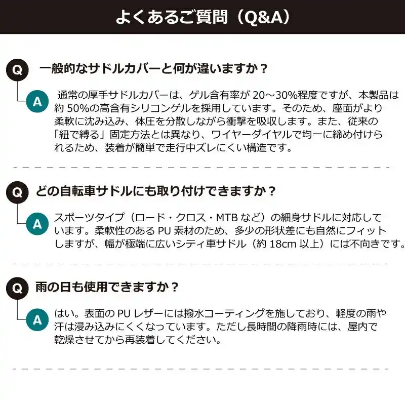 ●50%高含有シリコンゲルと低反発フォームの二層構造で坐骨の痛みを軽減。●ワイヤーフィットダイヤル構造により、片手で簡単・均一に締め付け。走行中のズレを徹底防止。●防水PUレザーとフルラップデザインで、雨・汗・汚れに強く、通勤・通学も安心。●中央通風チャンネルと人間工学デザインで、ムレを逃がし体圧を分散する快適設計。●ロードバイク、クロスバイク、MTBにフィットするスポーティかつ高級感のあるシンプルデザイン。