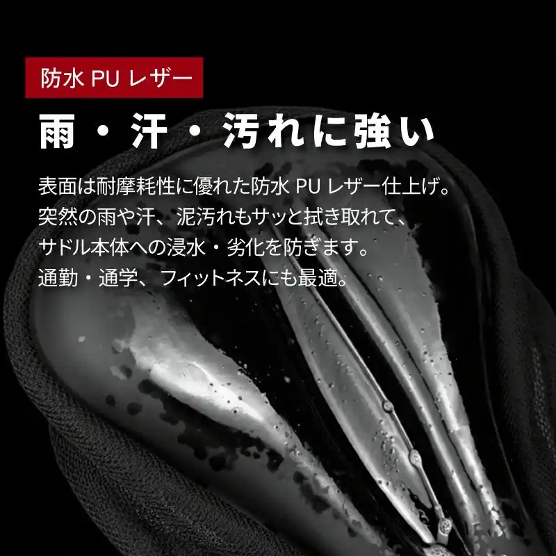 【通気性&防水】 ムレ知らずで全天候型ライドを 表面は雨・汗・汚れに強い防水PUレザーを採用し、サドルを全面から包み込むフルラップデザインで、雨天時の浸水やサドルの劣化を防ぎます。 さらに、クッション中央部には中央通風チャンネル構造を設置しています。 |