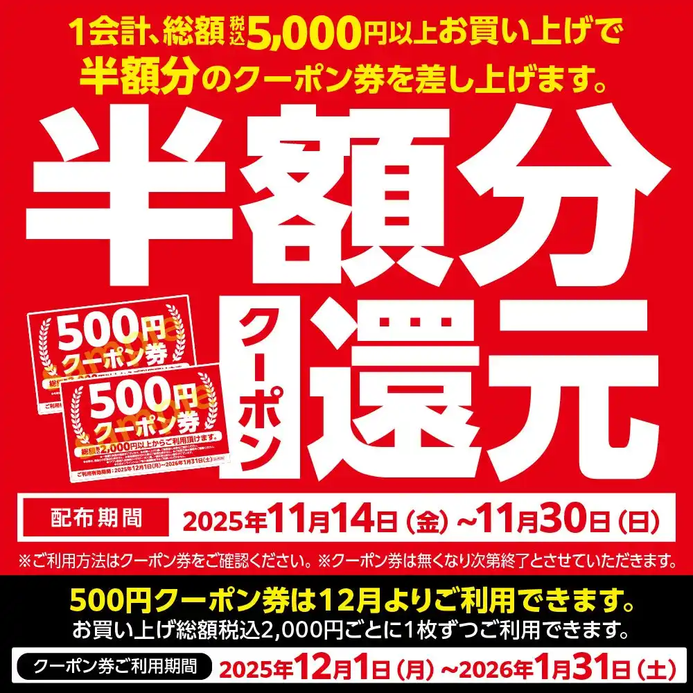 ◆同時開催中!半額分クーポン還元 |