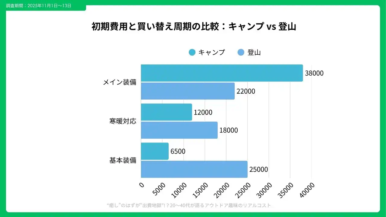 まず負担を感じやすいのが初期投資です。キャンプ・登山の両ジャンルで、代表的な装備の初期投資中央値と買い替え周期を抽出しました。 |