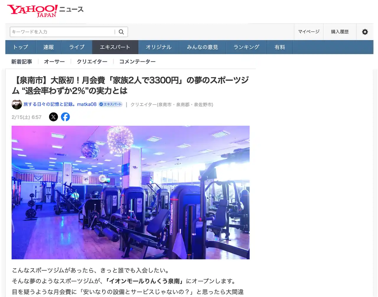 | 【泉南市】大阪初!月会費「家族2人で3300円」の夢のスポーツジム “退会率わずか2%”の実力とは」 | |||
