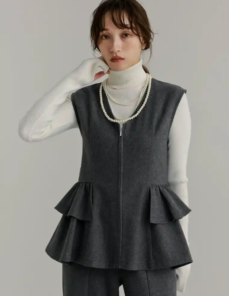 圧縮ウールライクフロントジップペプラムベスト |