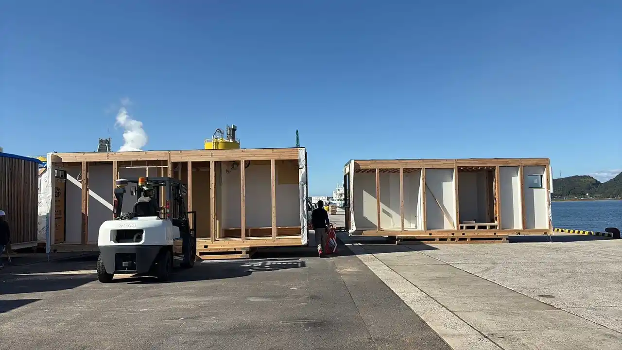 従来の建築では、すべての工程を現地(島内)で行う必要がありましたが、本プロジェクトでは建築ユニットを島外工場で完成させ、箱型のまま海上輸送して現地設置する方式を採用しています。 |