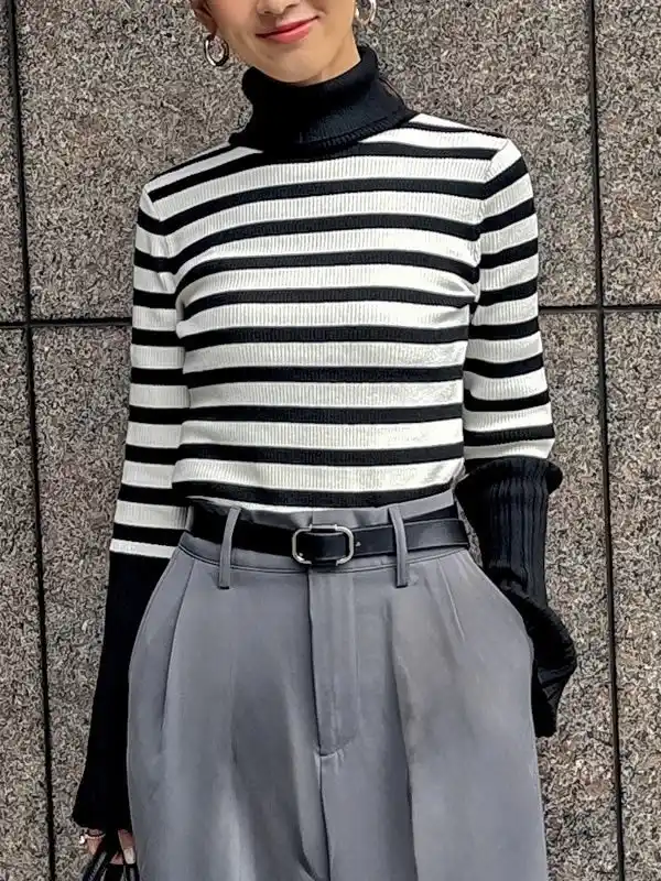 ボーダーが映えるニットはお袖の切り替えもアクセントになるので、ボトムにインするスタイリングに。 |