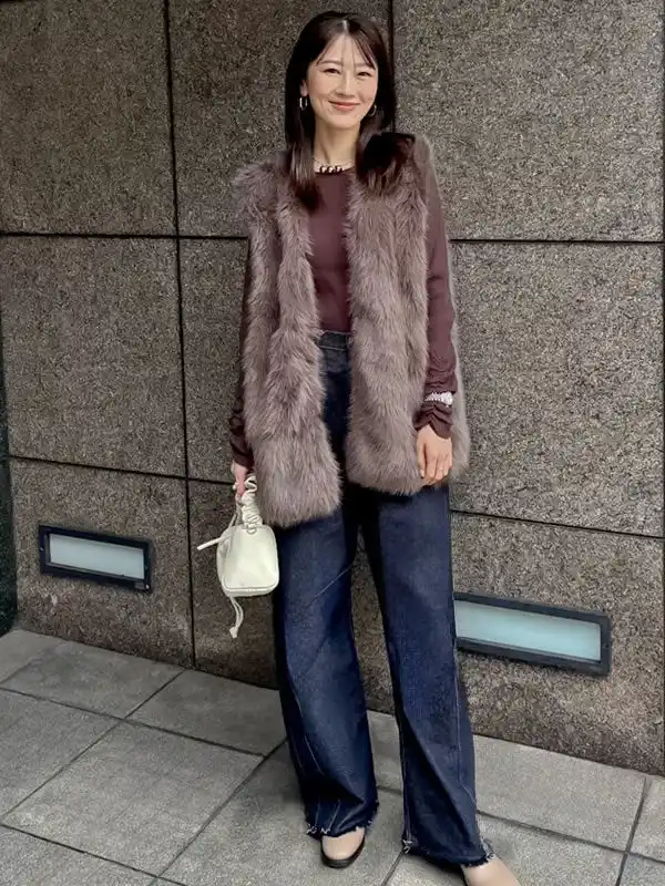 メインになるファージレですが、カラーが落ち着いたブラウンなので、大人っぽくまとめたくインナーも同色系に。 重ね着の季節は、色も多くなりがちなので、同色でまとめるのがポイントです。 ボリュームがあり高級感のあるファージレなのでインナーはすっきりとタイトなニットを。 お袖のギャザーもアクセントに見せるのがポイントです。 |