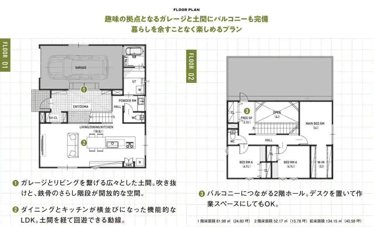 | 1.ガレージ×土間×さらし階段が描く動線 | |||