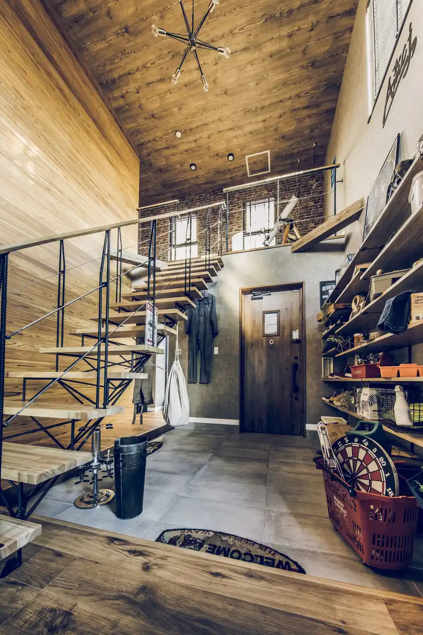 ガレージから土間、そしてリビングへとつながるスムーズな導線は、外遊び・趣味・家事のすべてを快適にするアメカジ工務店の定番スタイル。 吹抜けとさらし階段が空間の広がりを生み、階段横のレンガ壁が世界観を印象的に彩ります。 |