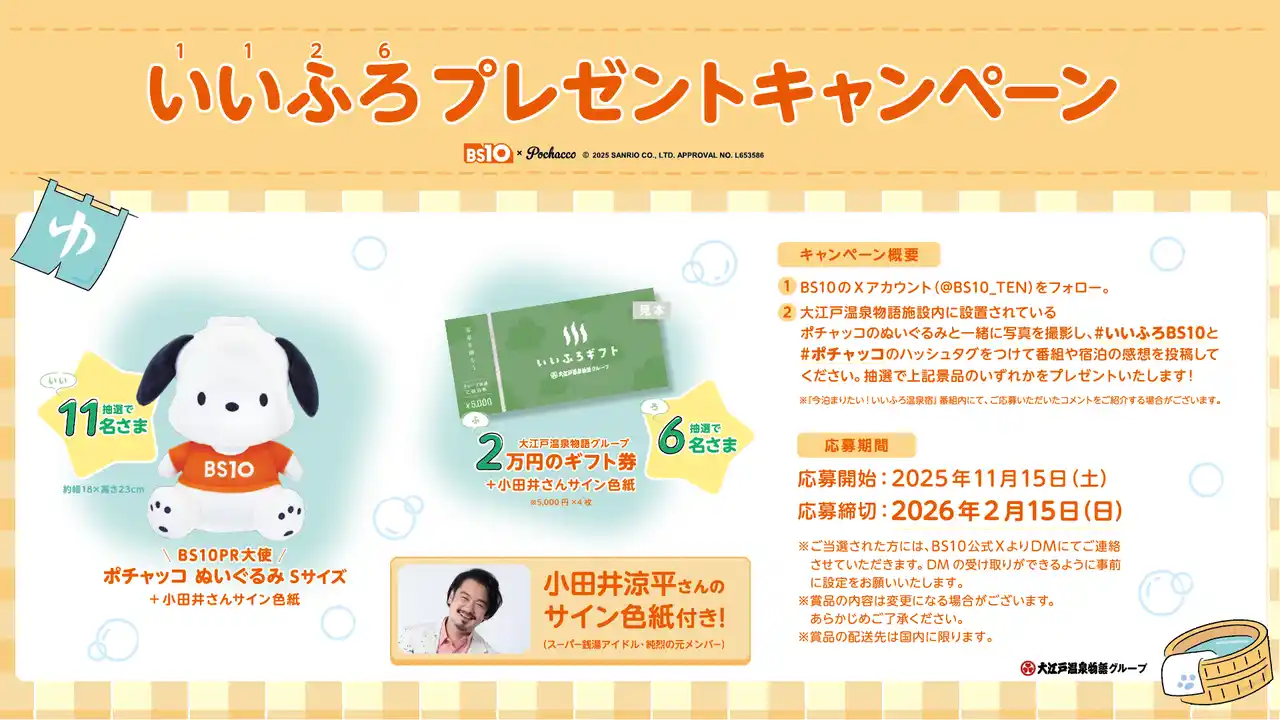 全国無料のBS放送局『BS10(読み:ビーエステン)』で、毎週月曜よる8時から放送している旅番組「今泊まりたい!いいふろ温泉宿」と、すべての世代の方に親しみやすい温泉宿を目指し「温泉」「バイキング」「おもてなし」の3つのこだわりをもって全国で温泉宿を展開する「大江戸温泉物語」とのコラボ企画「BS10×大江戸温泉物語 Presents いいふろプレゼントキャンペーン」が11月15日(土)から開催されます。 |