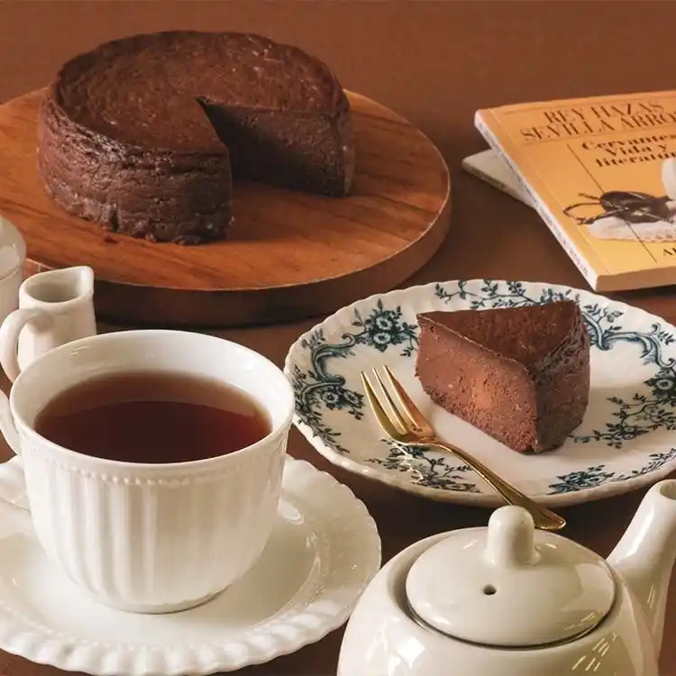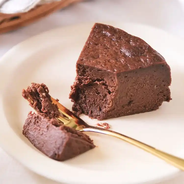 チョコレートに生クリームを加えて丁寧に乳化させ、生チョコレートを作る工程からはじまります。それをバスクチーズ生地に合わせることで、とろりとなめらかな口あたりに。バットにお湯を張った状態でオーブンに入れる「湯煎焼き」で、しっとり柔らかく仕上げました。 |