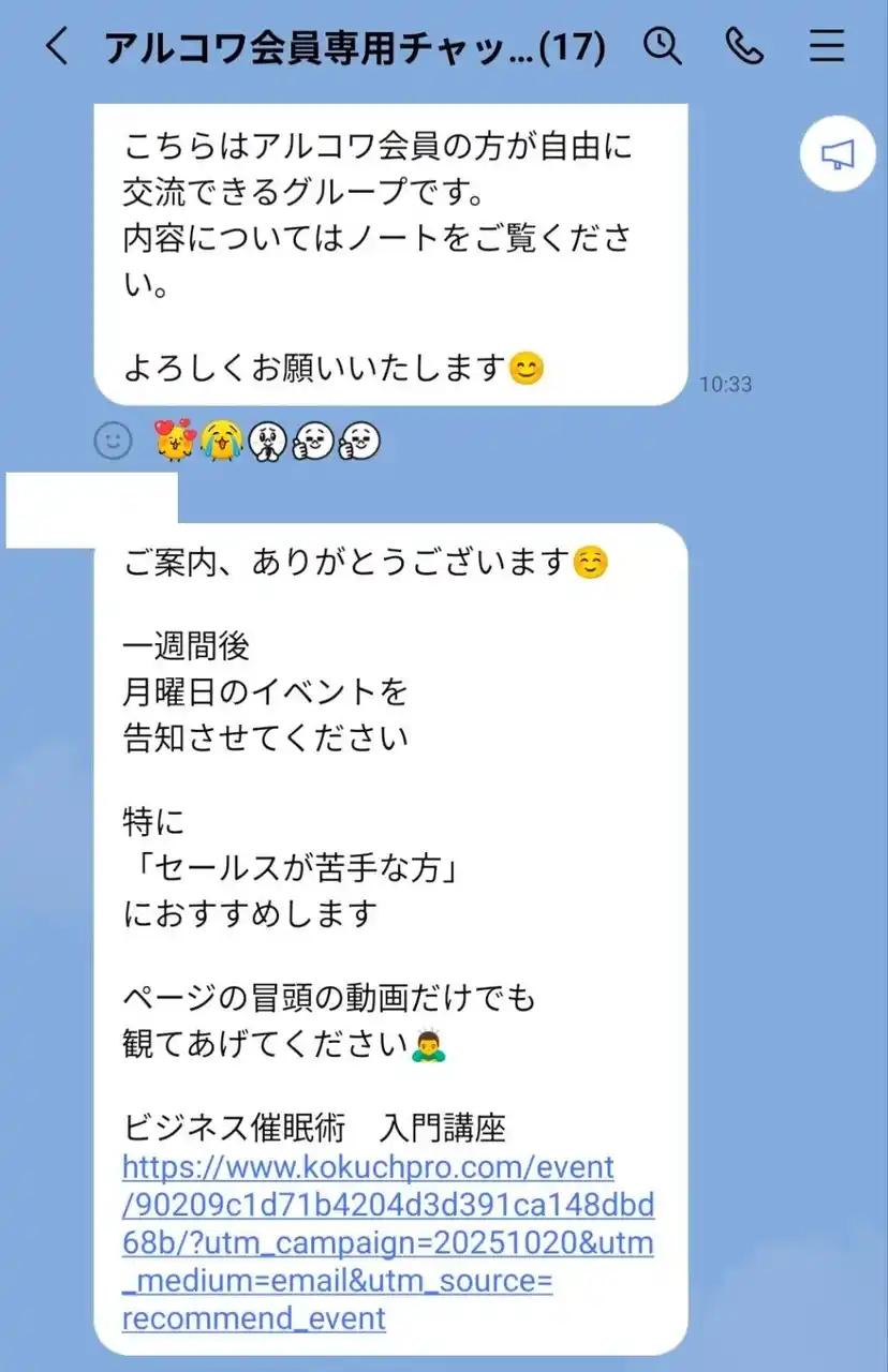 アルコワ会員限定のLINEグループに招待します。 コミュニティでは、以下のような発信が可能です。 ・人を紹介してほしい ・事業の紹介 ・イベントの告知 |
