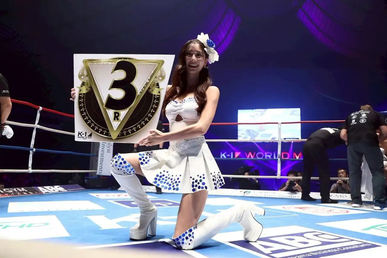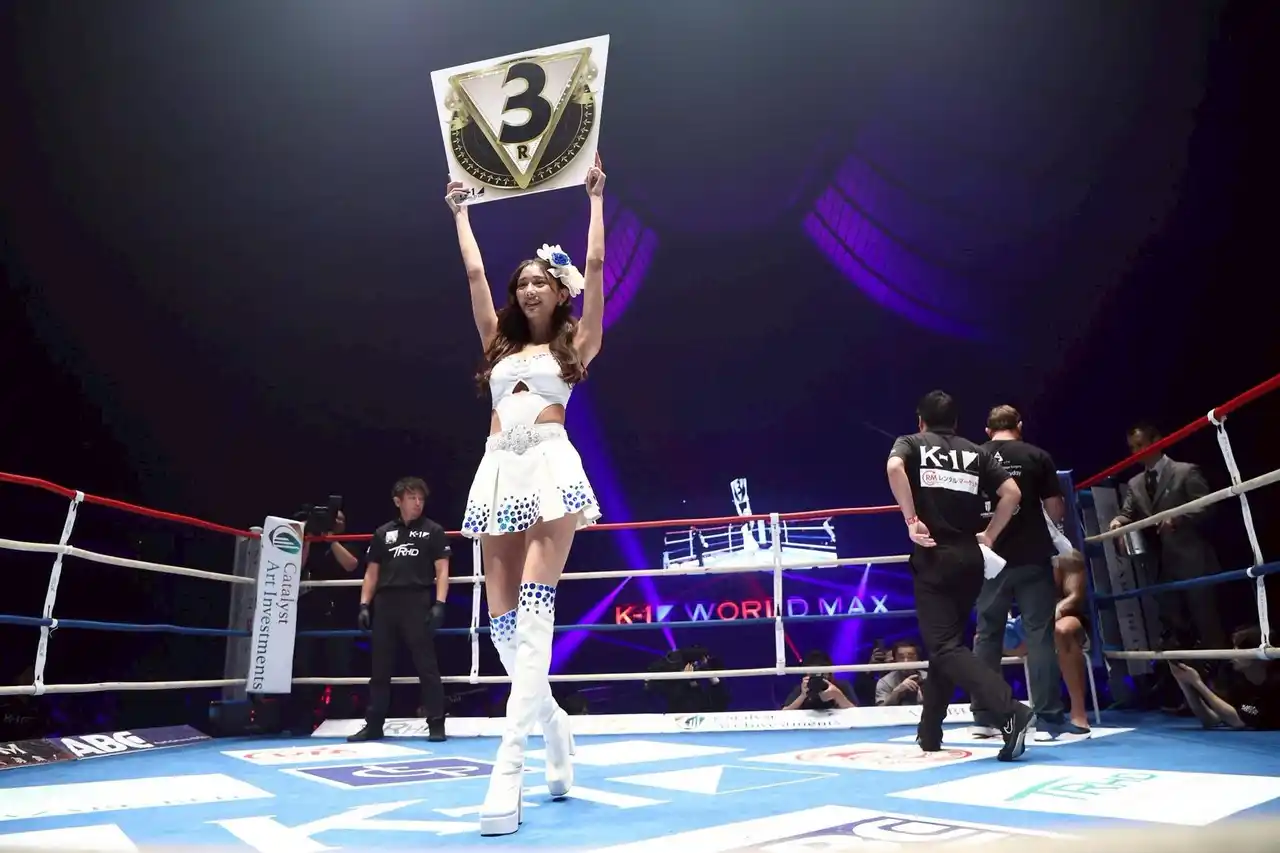 | スペシャルラウンドガール時ではボードを持ったまま座るポーズをされており、このポーズについて「これは以前、熊田曜子さんがラウンドガールをされた時の動画を拝見して、そちらを予習してポージングやウォーキングなどを取り入れさせていただきました」と、先輩グラビアモデルでもある熊田曜子さんを参考にされたようでした。最後に、本日の試合の感想を伺うと、「貴重な機会にお招きいただき大変光栄でした。機会があれば、ぜひ今後もK-1ファミリーの一員として大会を盛り上げられたら嬉しいです。」とコメントを頂きました。 | ||||||||||||||