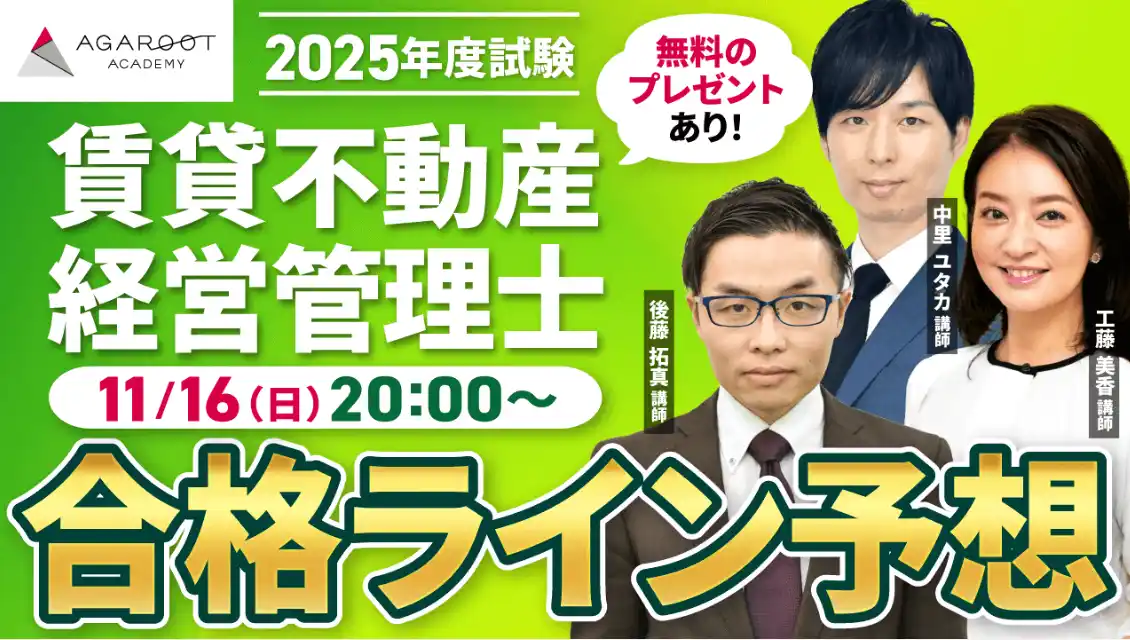 ------------------- アガルートアカデミーは2025年度(令和7年度)賃貸不動産経営管理士試験の試験当日に「解答速報」、「総評動画YouTubeLIVE配信」「合格ライン予想動画YouTubeLIVE配信」を無料で実施いたします。 |