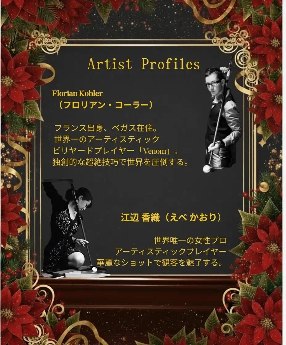 本イベントには、アーティスティック界のパイオニアであり世界的スター フロリアン・コーラー(Venom)、そして世界で唯一の女性プロアーティスティックプレイヤー 江辺香織(Ebe Kaori) が出演。華麗で精緻、そして芸術的なショットが交差する、ここでしか見られないプレミアムなステージをお届けします。 |
