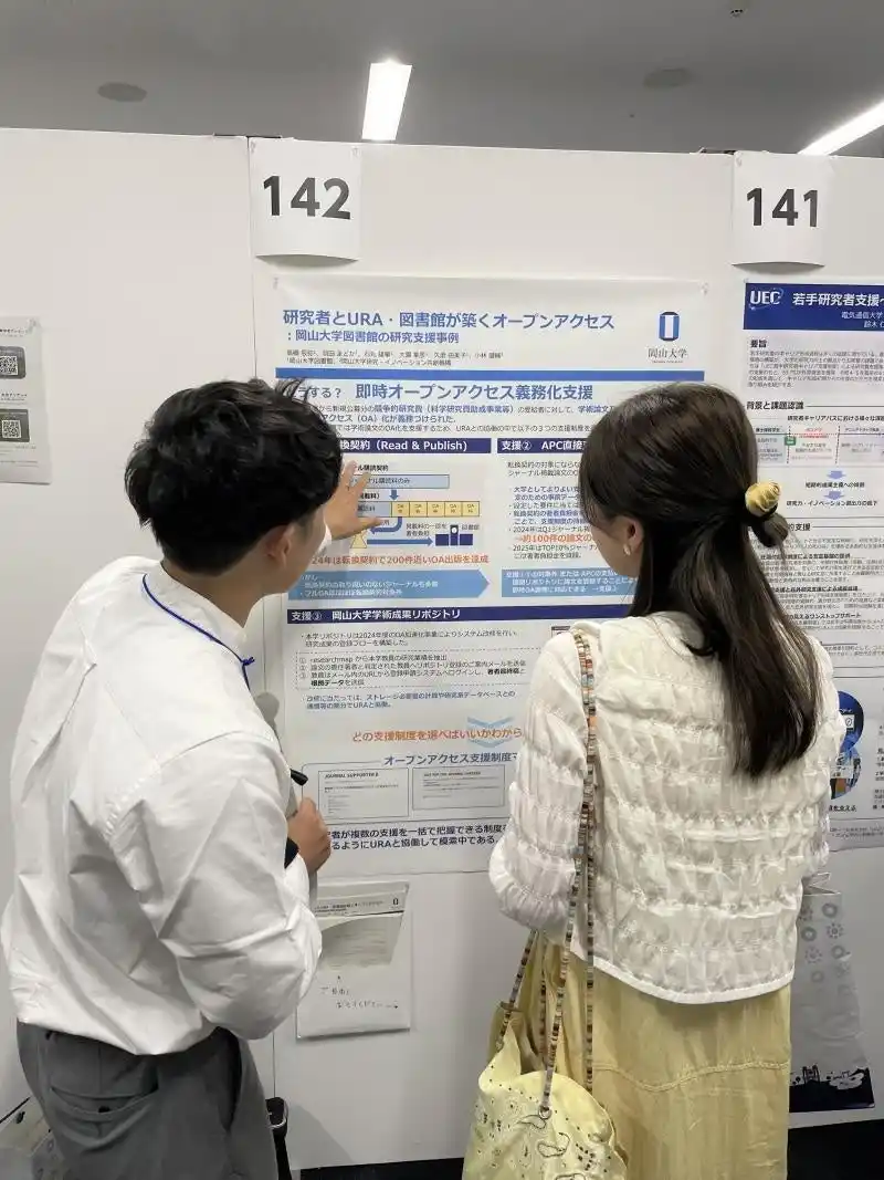 ○ポスター発表について 1. 研究者とURA・図書館が築くオープンアクセス:岡山大学図書館の研究支援事例 2025年度からの競争的研究費における即時オープンアクセス(OA)義務化を見据え、図書館がURAと連携して構築した研究支援体制について報告しました。転換契約、APC直接支援、学術成果リポジトリの活用に加え、研究者への最適な支援制度をマッチングするツールを開発し、効果的な研究支援を実現しています。 |