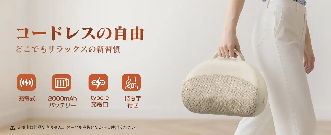 USB-C充電式でコード不要。 自宅・オフィス・車内など、好きな場所で使える軽量デザインです。2000mAhバッテリー搭載で、フル充電なら約5~6回(1回10分)の使用が可能です。 |