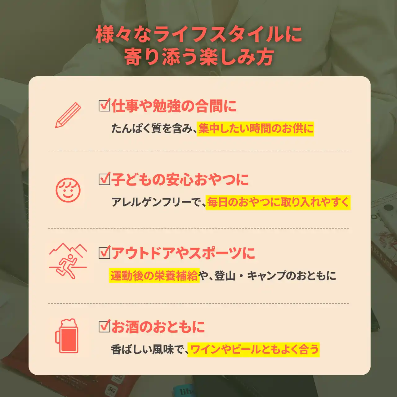 「Mamame テンペチップス」は、Non-GMO(非遺伝子組み換え)の黒目豆を使用した、ヴィーガン対応・グルテンフリーのヘルシースナックです。1袋(50g)あたり5gのたんぱく質と6gの食物繊維を含み、さらにビタミンDやカルシウムも含まれています。保存料を使用せず(※1)に13カ月の保存が可能で、仕事や勉強の合間のおやつ、運動後のリフレッシュ、ワインのおつまみなど幅広いシーンでお楽しみいただけます。 |
